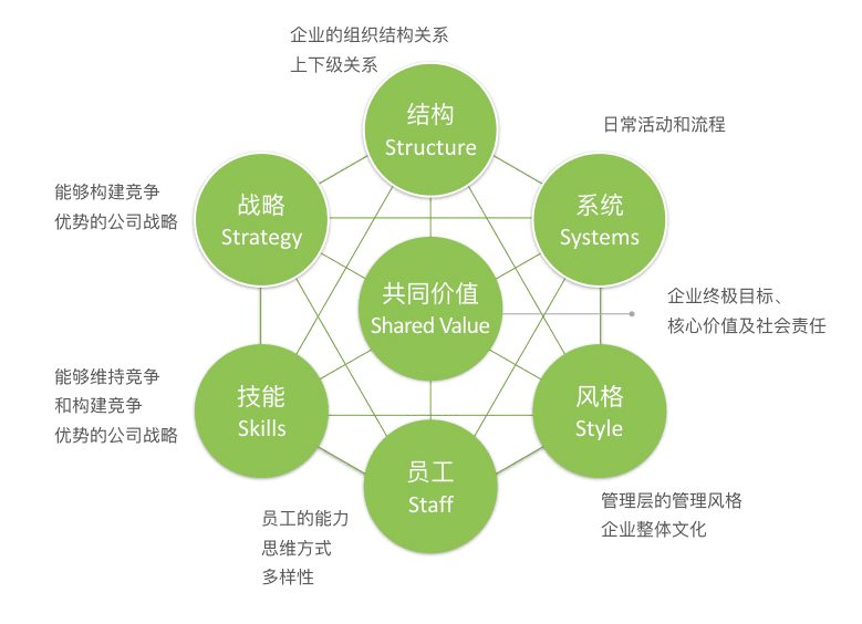 7-S模型指出了企业在发展过程中必须全面地考虑各方面的情况,包括结构(Structure)、系统(Systems)、风格(Style)、员工(Staff)、技能(Skills)、战略(Strategy)、共同价值观(Shared Values)。