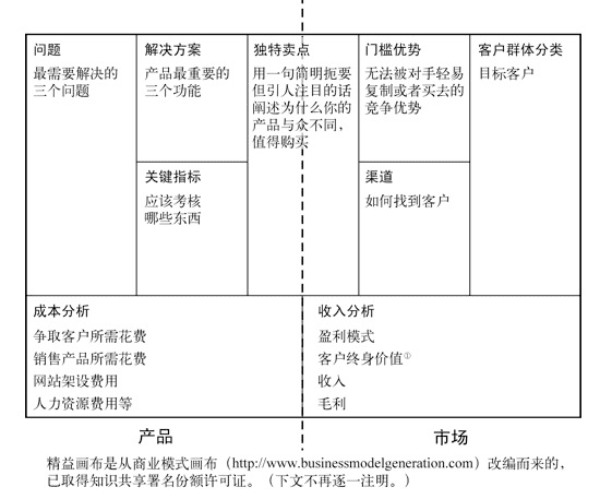 因此,当我在分析具体产品问题的时候,精益画布是一个不错的帮手。其脱胎于商业模式画布,但是精益画布比商业模式画布更偏重于产品和执行。 具体的可以参考这篇文章:新技能get√:如何用五分钟讲清楚你的创业项目在新窗口打开 如果有兴趣研究的话可以阅读这本书:精益创业实战