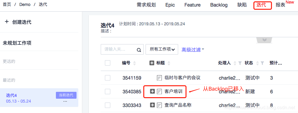 最后,从迭代中选取差不多工作量的低优先级工作项移回到Backlog中,即在DevCloud中完成了工作项的等价交换。