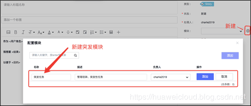 这里给出一个DevCloud产品很好的小实践,可以提供客观数据帮助回顾。新纳入迭代待办列表的突发性工作项可以在DevCould的“模块”下进行管理。也就是说,在新建User Story之前建立一个“突发任务”模块,然后将User Story中的“模块”属性选中它。这是为了在后续几个迭代中对这类突发性工作进行度量分析(可以按模块排序,方便度量分析)以便持续改善做准备。如下新建突发模块图和新建User Story图所示: