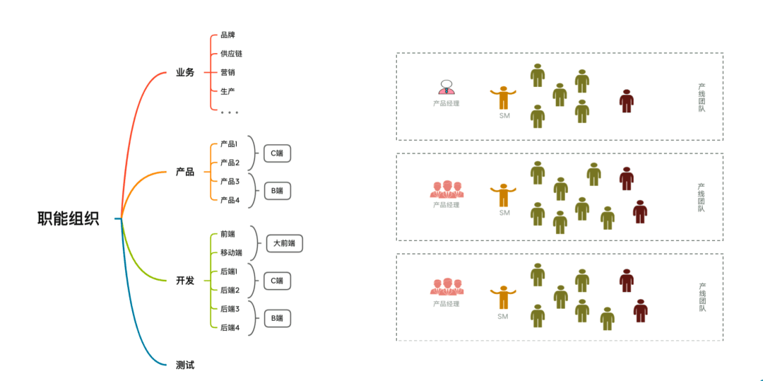 在日常工作过程中,需要产研配合,在产品线上进行产品迭代开发。因此形成了跨职能的产线团队,跨职能团队由产品经理、开发、测试共同组成。