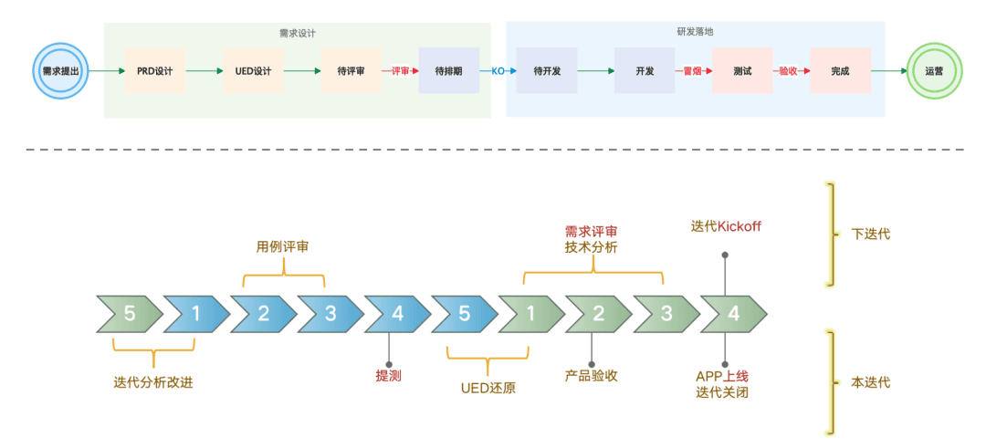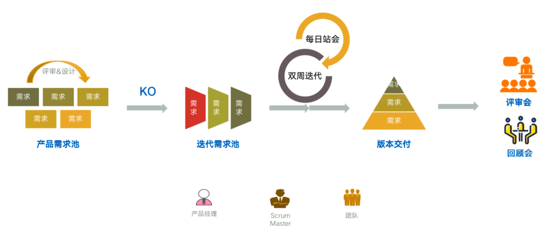 - PO将需求提在产品需求池中,经过评审、设计、迭代规划(KO),进入迭代需求池;