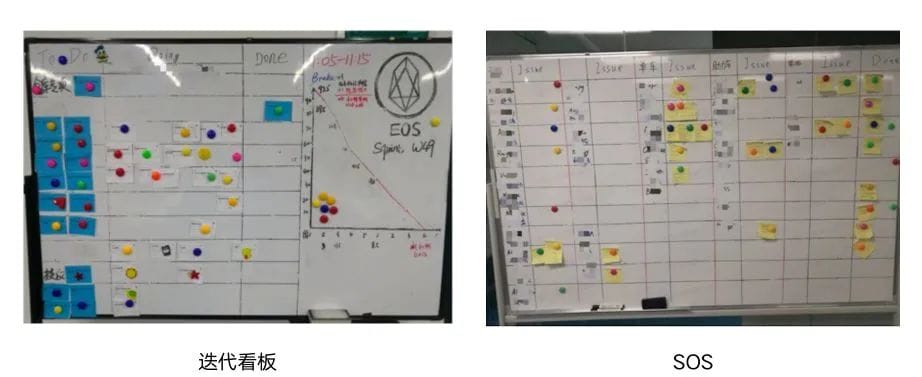 团队每日站会之后,我们会有一个SOS的站会,利用SOS(Scrum of Scrum)看板解决跨团队、跨部门的风险预警、障碍解决: