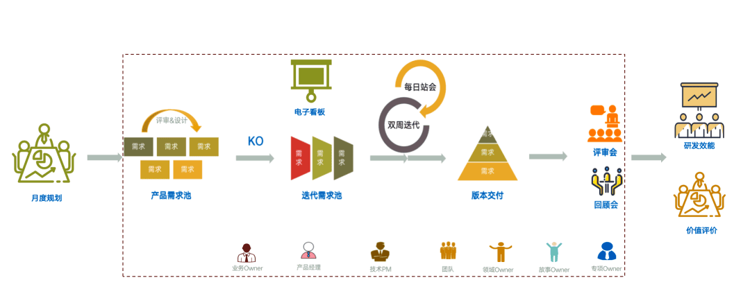 价值交付牵涉到端到端的协同,研发团队需要与产品、业务团队一起进行目标对齐、过程协同、价值评价。我们采用产研月会的形式,拉通双方。