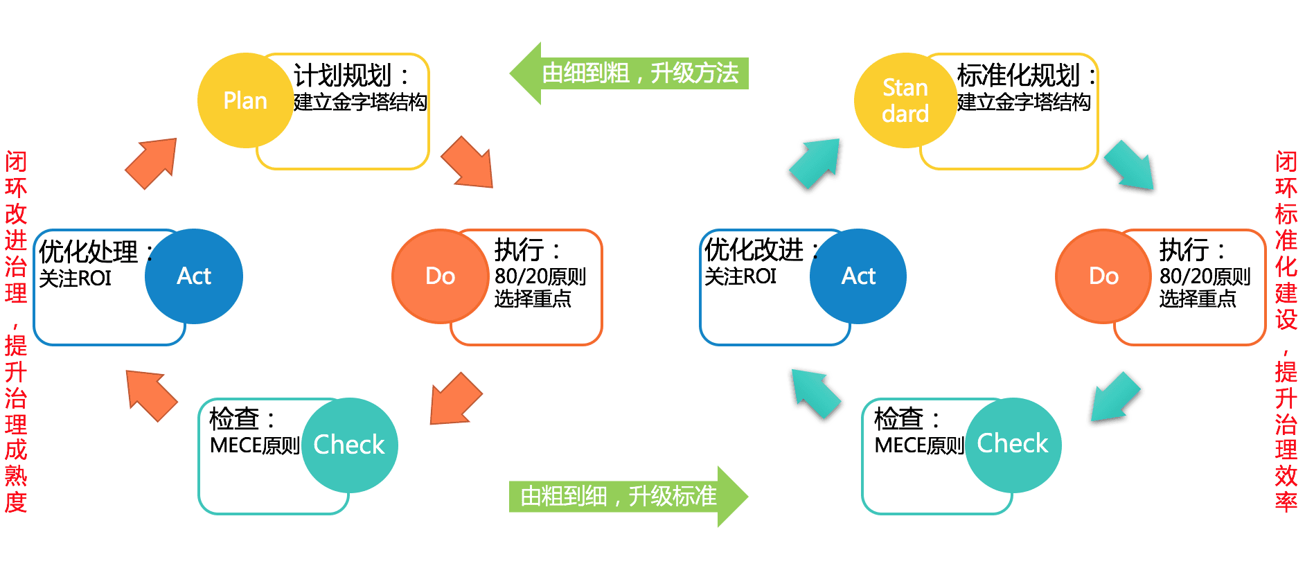 - 在Plan或Standard阶段要做的事:建立意识->确定目标->分析现状->确定评价指标。