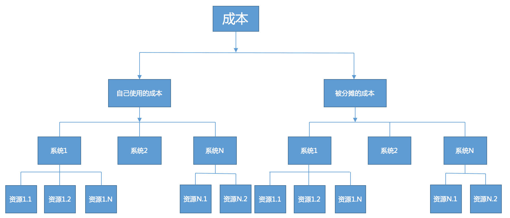 - 分解原子项目。在本阶段要建立一个完全细化的分级结构,用金字塔原理中的”MECE不重不漏”原则,将工作内容分解到最细的可控粒度。至于按哪个维度进行拆分,不同的团队或者业务可能会有不同的原则,比如有些团队直接按子团队进行拆分,有些团队按业务进行拆分,有些团队按流程进行拆分。从较多团队通用的角度,成本控制这件事,可以简单的将指标分解到二级指标,包括“自身使用的成本”和“被分摊的成本”。其中,“自身使用的成本”是指,为了满足自己业务的需要,由本技术团队申请或者使用资源产生的成本;“被分摊的成本”是指,由于根据某种计算逻辑,间接使用了其他团队的资源,为其他技术团队承担一部分成本费用,比如常见的资源包括公司其他团队开发的广告、投放、风控、安全等系统。如果可以分拆到具体的系统,则每个系统又可以继续向下拆分到更细粒度的构成项目,每个节点都是一个小的“总分”结构,按这个逻辑继续向下分解,可以分为“可落地的最细粒度的成本”和“可落地的最细粒度的分摊成本”。