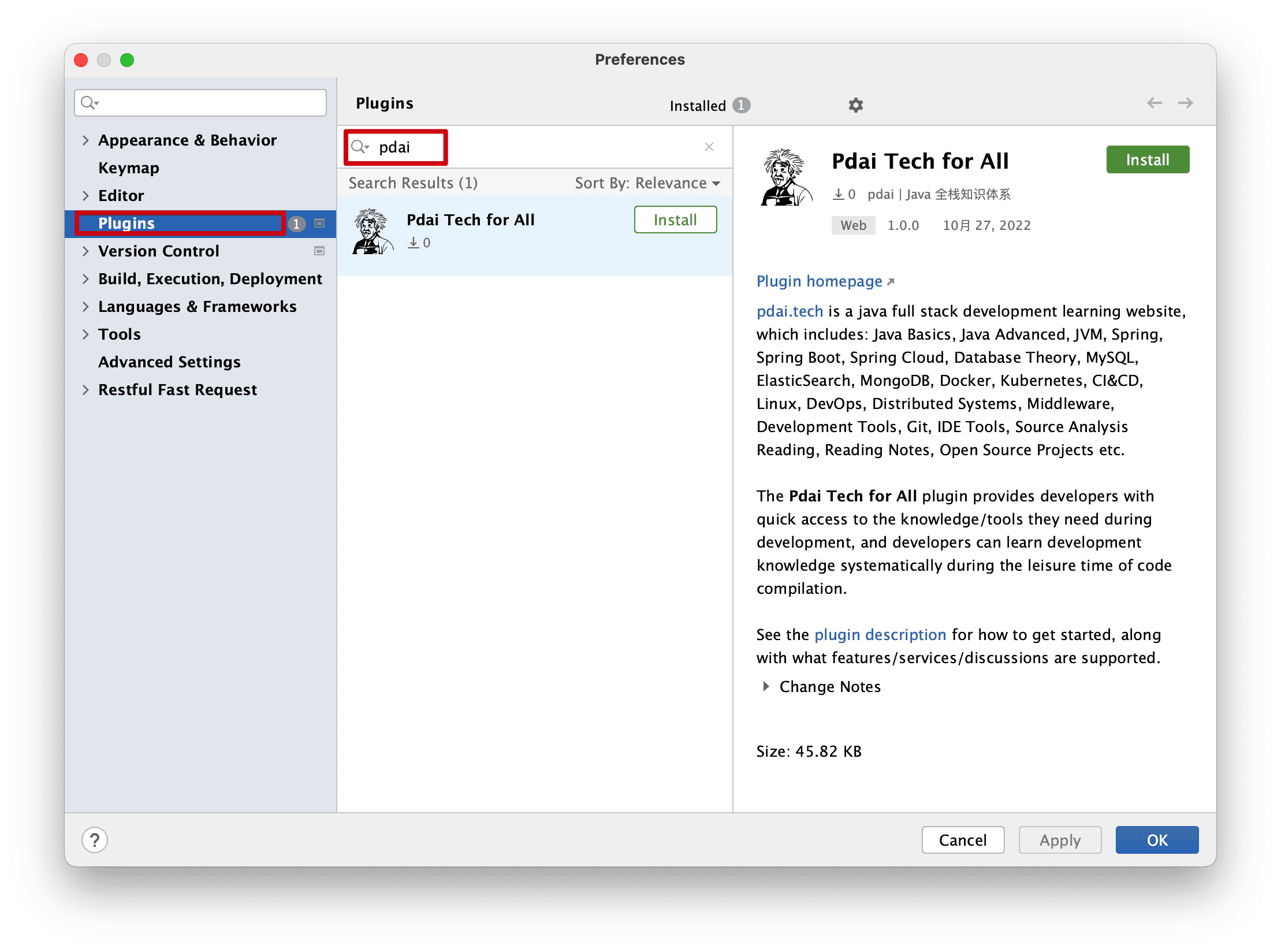打开Settings配置,点击Plugins的配置项,在market中搜索 “pdai”