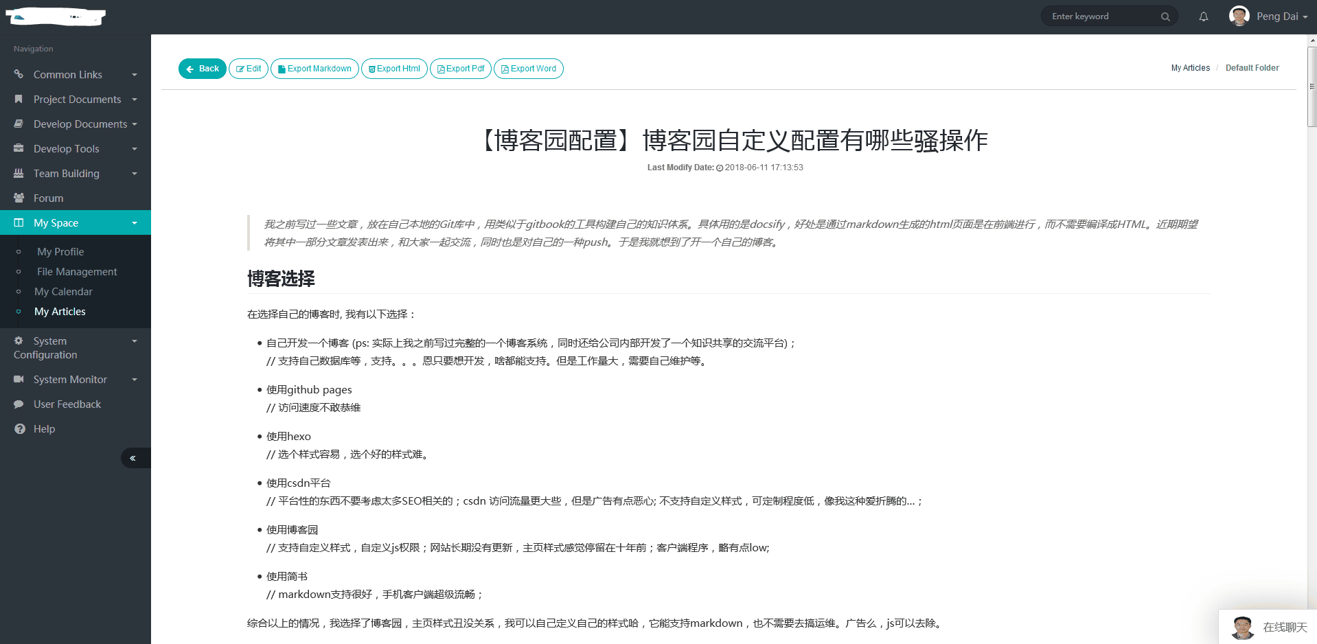 以下系统由我独立设计,开发和运维(总计四万多行代码吧), 这里只展示博客文档部分。以下图片是我在之前博客园写文章截图的: