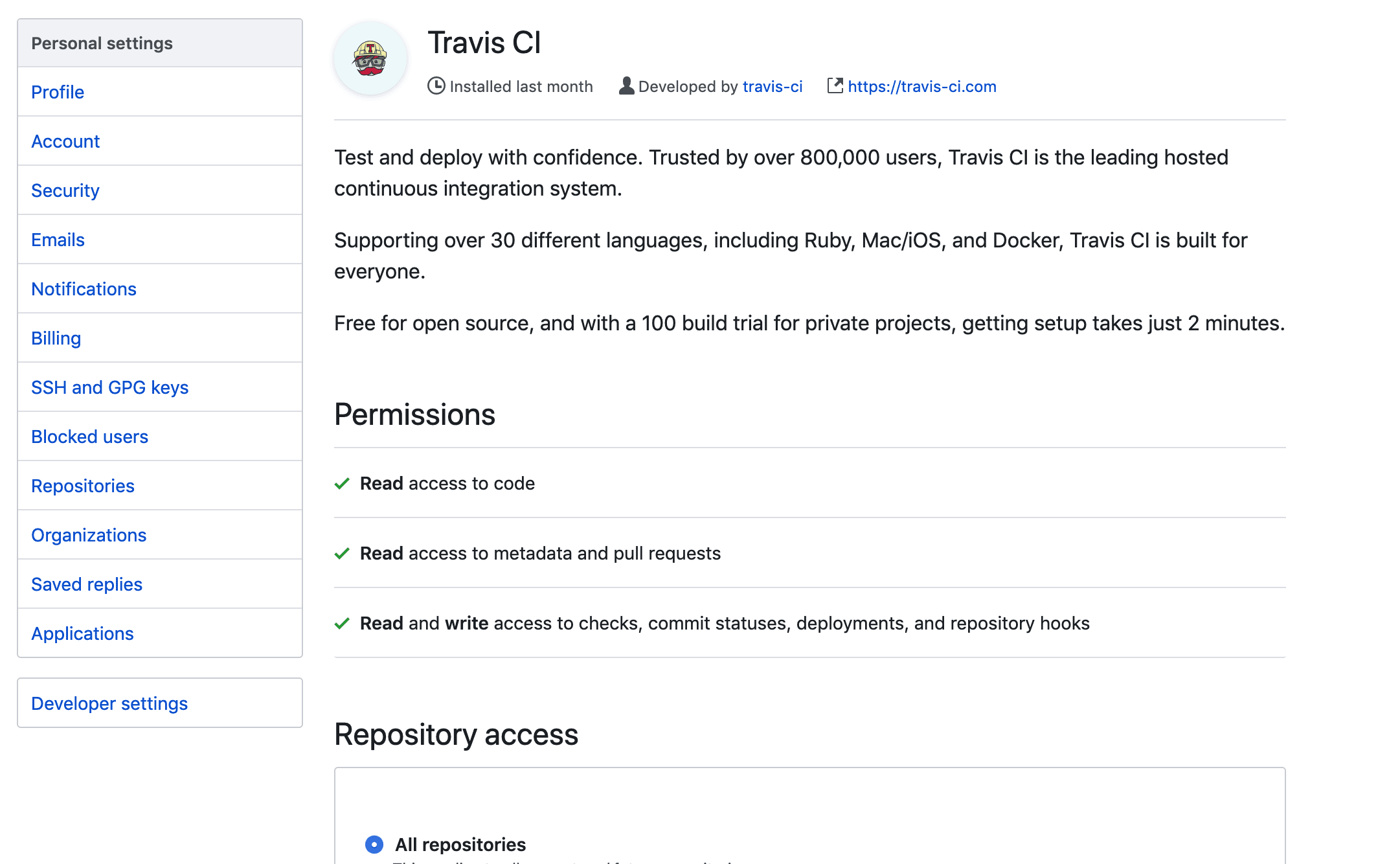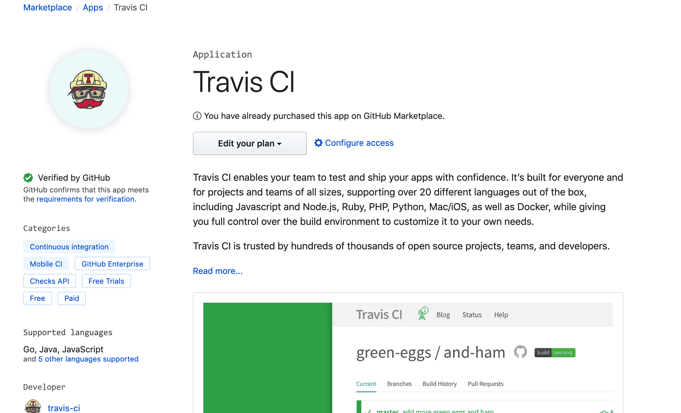 进入 https://github.com/marketplace/travis-ci