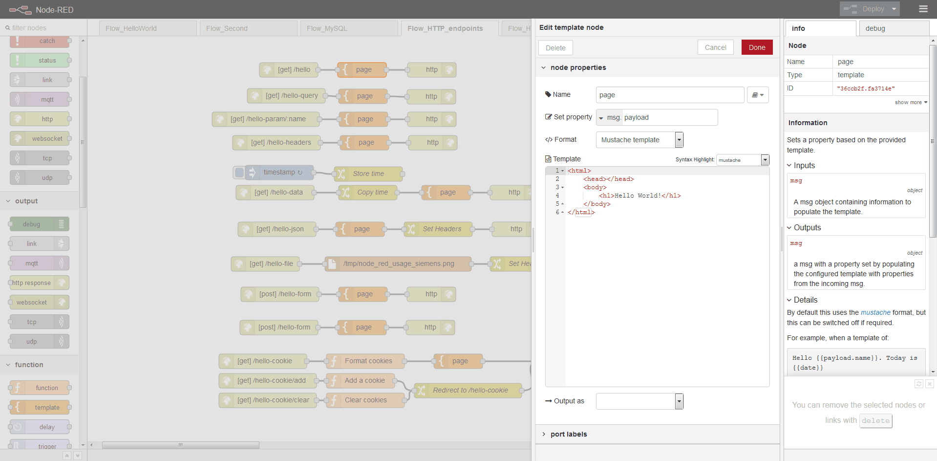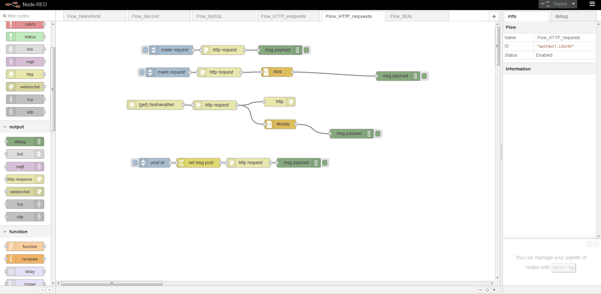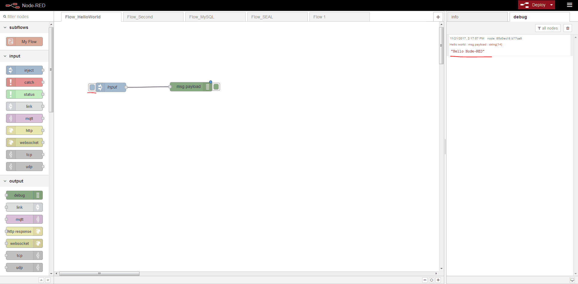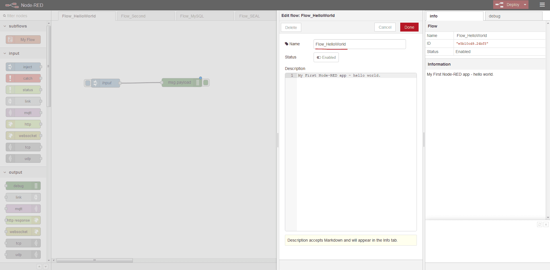 Node-RED provides a browser-based flow editor that makes it easy to wire together flows using the wide range of nodes in the palette. Flows can be then deployed to the runtime in a single-click.