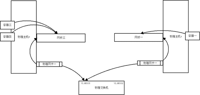 主机 A 和主机 B 的网卡一都连着物理交换机的同一个 vlan 101,这样网桥一和网桥三就相当于在同一个物理网络中了,而容器一、容器三、容器四也在同一物理网络中了,他们之间可以相互通信,而且可以跟同一 vlan 中的其他物理机器互联。