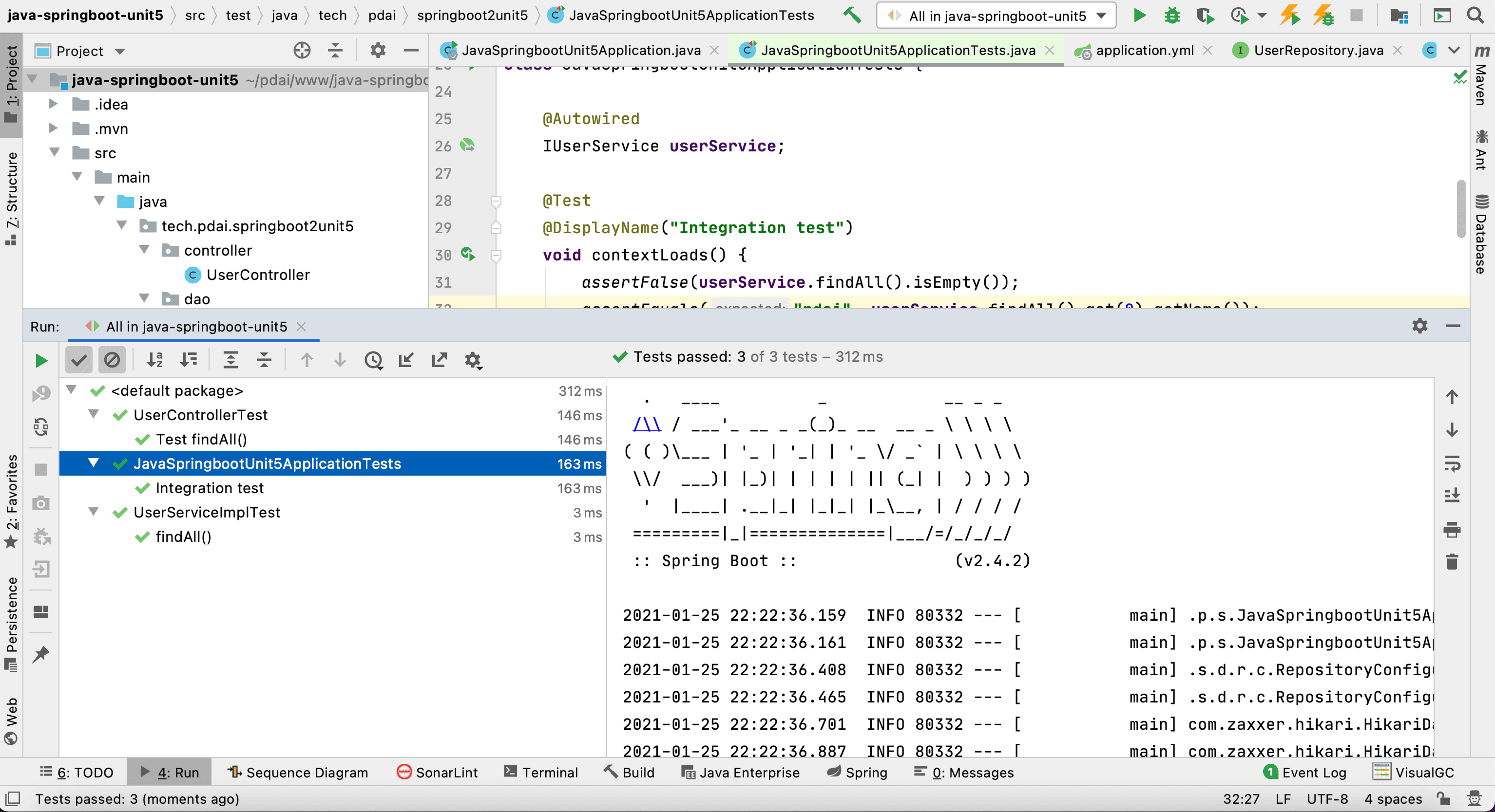 在真实的开发中,我们通常是使用SpringBoot的,目前SpringBoot是v2.4.x的版本(SpringBoot 2.2.2.RELEASE之前默认是使用 JUnit4,之后版本默认使用Junit5);所以我们写个基于SpringBoot2.4+H2的内存库的简单例子,同时加点必要的单元测试。@pdai