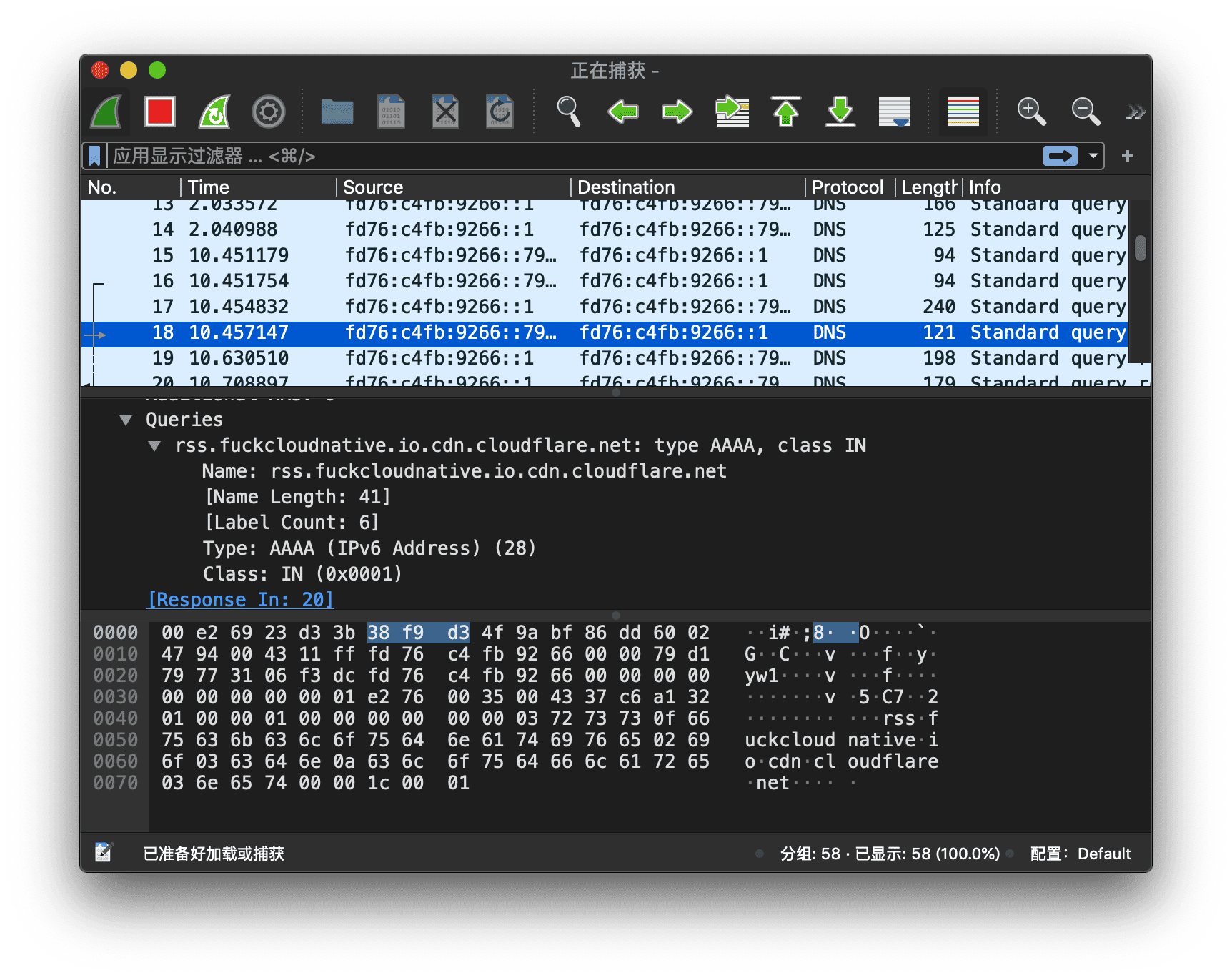 $ ssh root@remotesystem 'tcpdump -s0 -c 1000 -nn -w - port 53' | /Applications/Wireshark.app/Contents/MacOS/Wireshark -k -i -抓取到的数据: