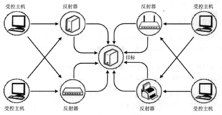 但是这种直接方式通常依靠受控主机本身的网络性能,所以效果不是很好,还容易被查到攻击源头。于是反射攻击就出现。