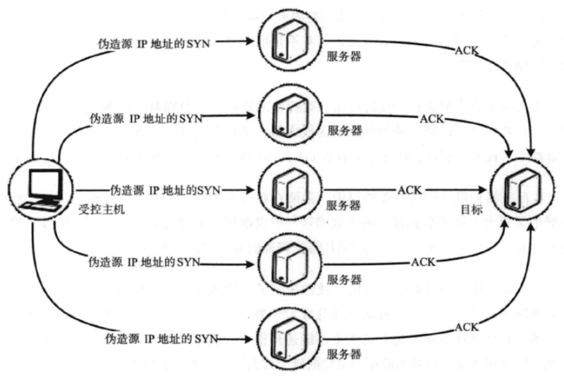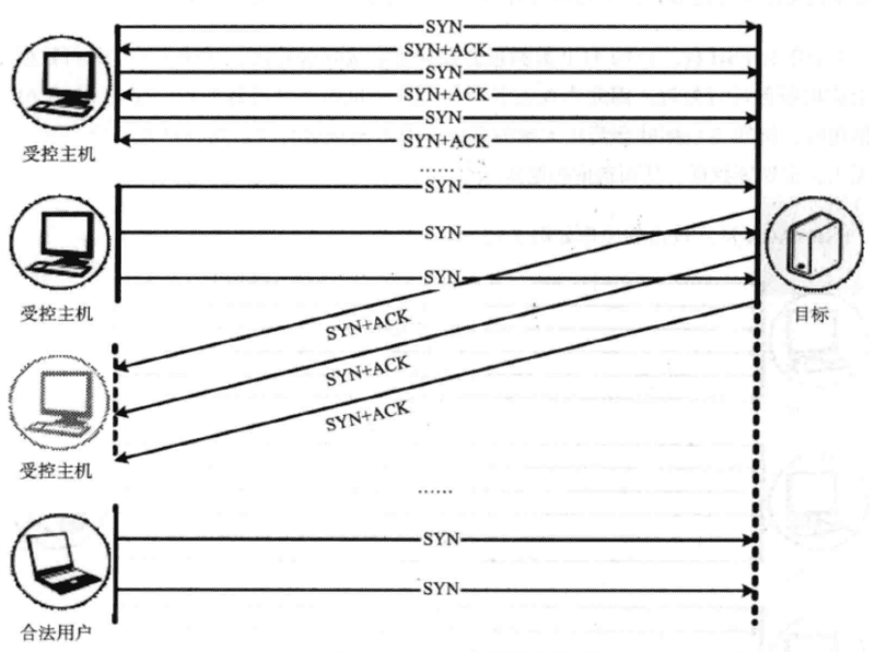 在建立TCP连接的过程中,如果在服务器返回SYN+ACK报文后,客户端由于某种原因没有对其进行确认,这时服务器端就需要重传SYN+ACK报文,并等待客户端的确认报文直到TCP连接超时,这种等待客户确认的连接状态通常被称为半开连接。 在连接超时之前,半开连接会一直保存在服务器的连接表中。 由于连接表的大小是有限的,如果在短时间内产生大量的半开连接,而这些连接又无法很快的结束,连接表就会很快被占满,导致新的连接TCP连接无法建立。