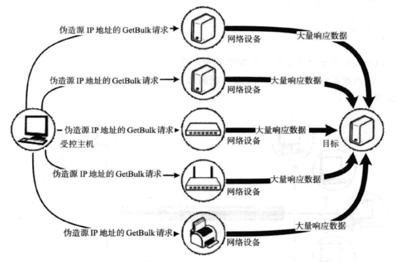 攻击者向广泛存在并开启了SNMP服务的网络设备发送Getbulk请求,使用默认通信字符串作为认证凭据,并将源IP地址伪造成攻击目标的IP地址,设备收到Getbulk请求后,会将响应结果发送给攻击目标,当大量的响应结果涌向攻击目标时,就会导致攻击目标网络拥堵和缓慢,造成拒绝服务攻击。 攻击者发送的Getbulk请求数据包约为60字节,而请求的响应数据能够达到1500字节以上,因此,使用该方式进行放大攻击能够达到25倍以上的放大效果,这也是一种放大效应明显且有效的放大攻击方式。