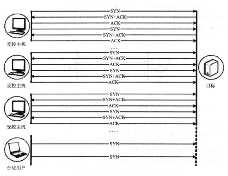 在三次握手进行的过程中,服务器会创建并保存TCP连接的信息,这个信息通常被保存在连接表结构中,但是,连接表的大小是有限的,一旦服务器接收到的连接数量超过了连接表能存储的数量,服务器就无法创建新的TCP连接了。攻击者可以利用大量受控主机,通过快速建立大量恶意的TCP连接占满被攻击目标的连接表,使目标无法接受新的TCP连接请求,从而达到拒绝服务攻击的目的。