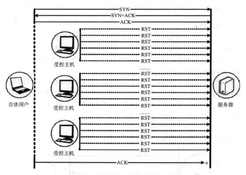 很多情况下,攻击者不会与被攻击客户端或服务器处于同一内网,导致发动TCP RST攻击时难以获取端口和序列号,在这种情况下,攻击者可以利用大量的受控主机猜测端口和序列号,进行盲打,发送RST洪水攻击,只要在数量巨大的RST报文中有一条与攻击目标的端口号相同,并且序列号落在目标的接收窗口之中,就能够终端连接。
