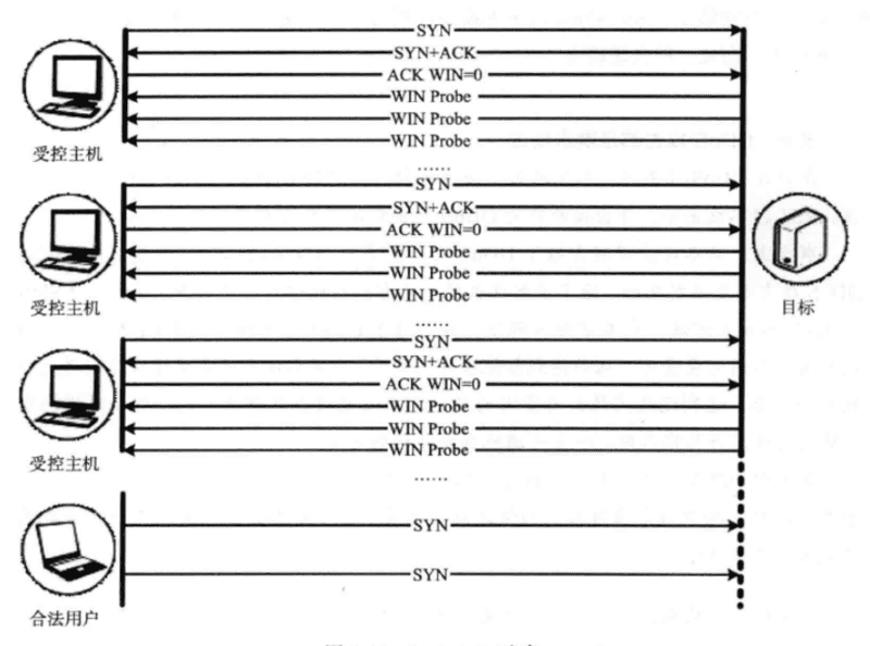 Sockstress攻击是研究人员在2008年提出的一种攻击TCP连接的方法,与前面几种攻击方式不同的是,Sockstress攻击不需要在短时间内发送大量的攻击流量,因此不属于洪水攻击,而是一种慢速攻击。