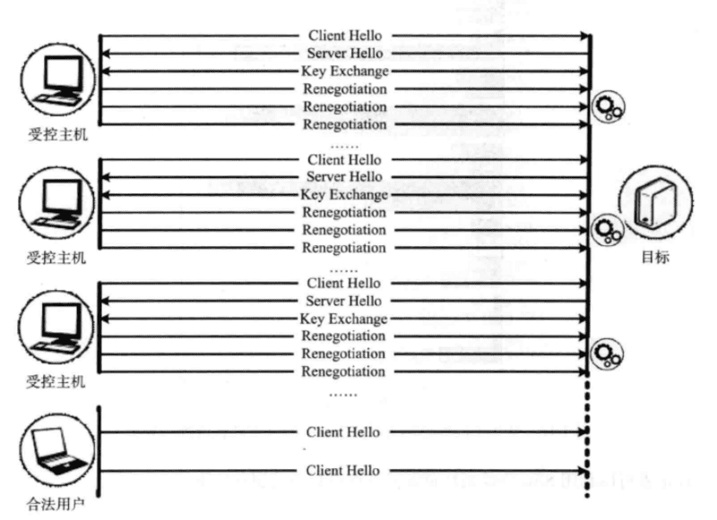 THC SSL DOS攻击是安全研究人员在2011年提出的一种针对SSL的拒绝服务攻击方法,这种方法就是利用Renegotiation选项,造成被攻击目标资源耗尽,在进行SSL连接并握手之后,攻击者反复不断的进行秘钥重新协商过程,而秘钥重新协商过程需要服务器投入比客户端多15倍的CPU计算资源,攻击者只需要一台普通的台式机就能拖慢一台高性能服务器,而如果有大量主机同时进行攻击,则会使服务器忙于协商秘钥而完全停止响应。