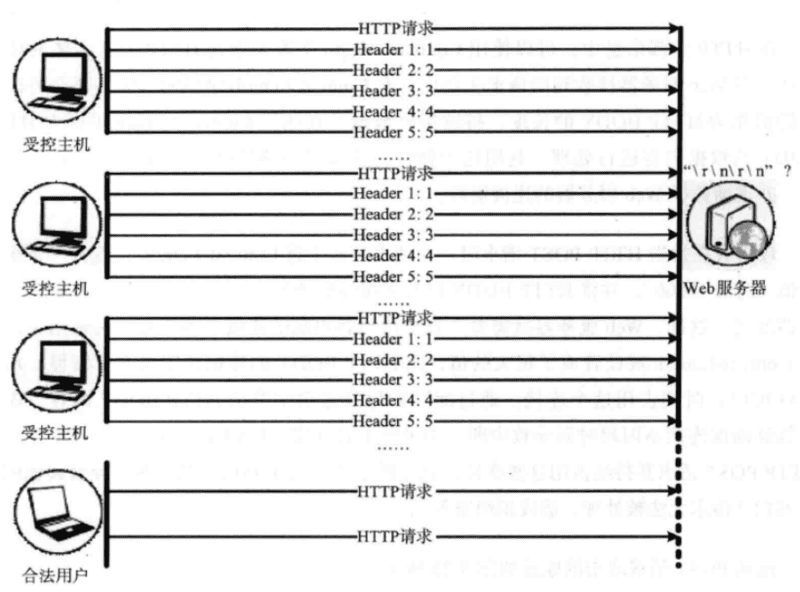 攻击者在发送HTTP GET请求时,缓慢的发送无用的header字段,并且一直不发送“rnrn”结束标志,这样就能够长时间占用与Web服务器的连接并保证该连接不被超时中断,然而,Web服务器能够处理的并发连接数是有限的,如果攻击者利用大量的受控主机发送这种不完整的HTTP GET请求并持续占用这些连接,就会耗尽Web服务器的连接资源,导致其他用户的HTTP请求无法被处理,造成拒绝服务。