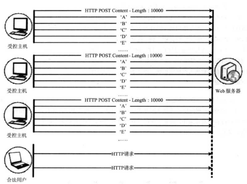 攻击者在发送HTTP POST请求时,在请求头部中将Content-Length设置为一个很大的值,并将HTTP BODY以非常缓慢的速度一个字节一个字节的向Web服务器发送,这样,Web服务器就需要一直维持与客户端的连接并等待数据传输结束,由于Content-Length被设置成了很大的值,而HTTP BODY的传输速度又非常缓慢,攻击者就可以长时间占用这个连接,通过间断性的发送单字节的HTTP BODY内容,攻击者就能够确保连接不因超时而导致中断,如果攻击者利用大量的受控主机发送这种缓慢的HTTP POST请求并持续占用这些连接,就会耗尽Web服务器的连接资源,导致其他用户的HTTP请求无法被处理,造成拒绝服务。