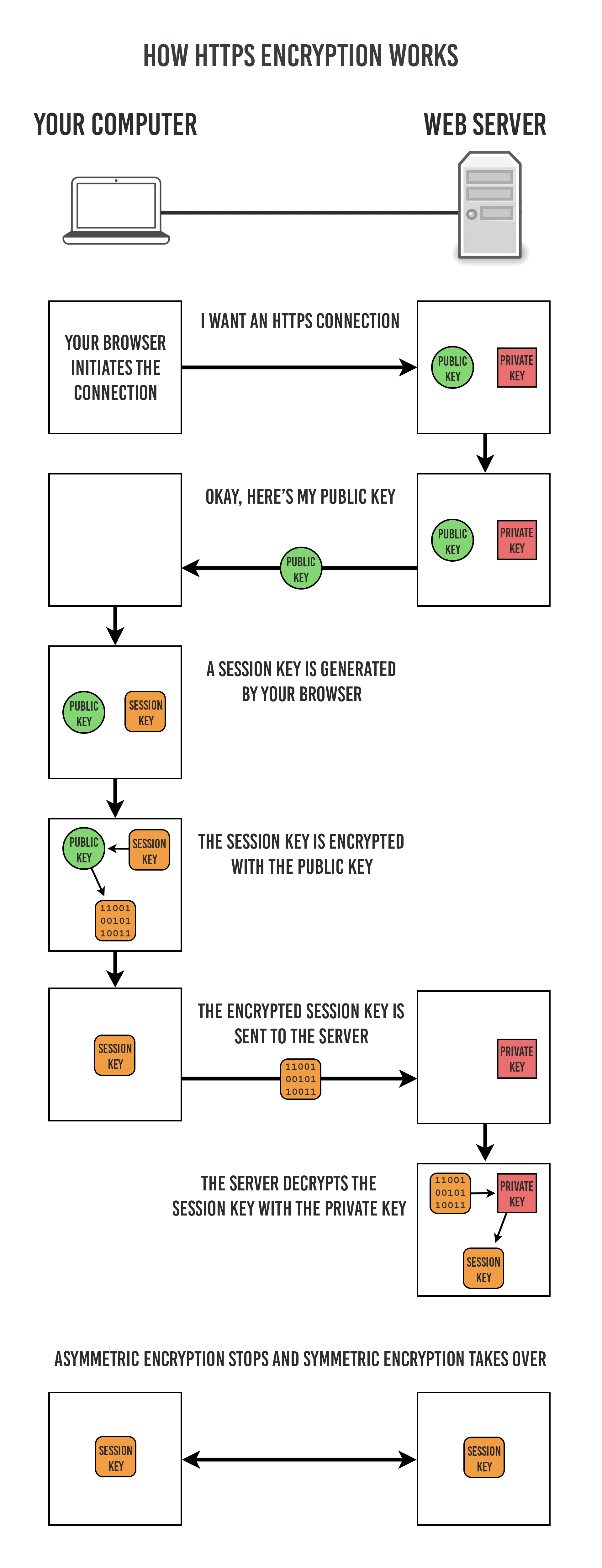HTTPs 采用混合的加密机制,使用非对称密钥加密用于传输对称密钥来保证传输过程的安全性,之后使用对称密钥加密进行通信来保证通信过程的效率。(下图中的 Session Key 就是对称密钥)