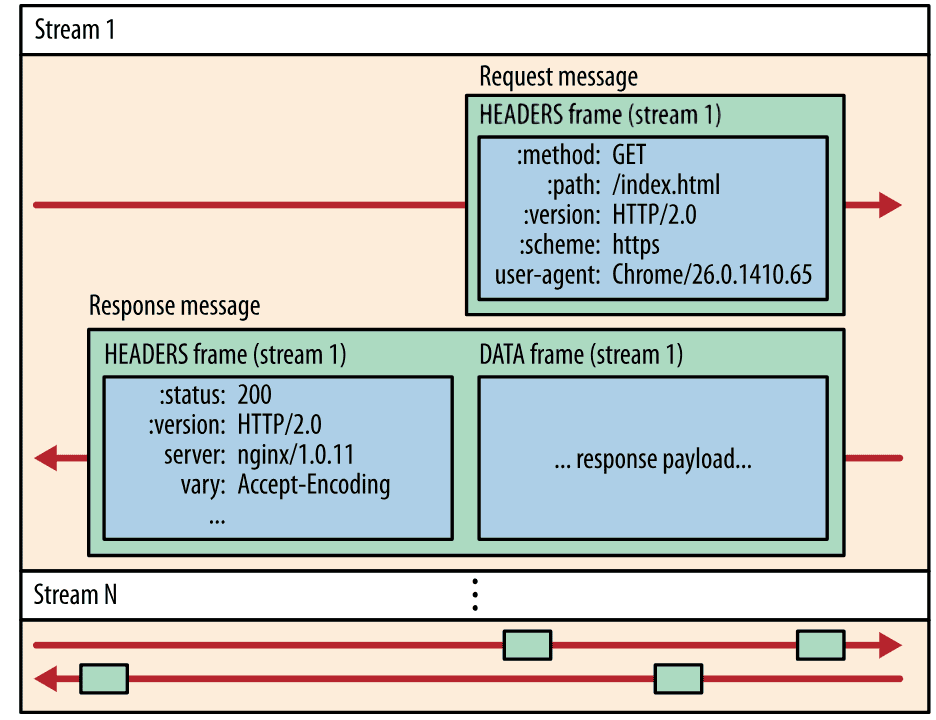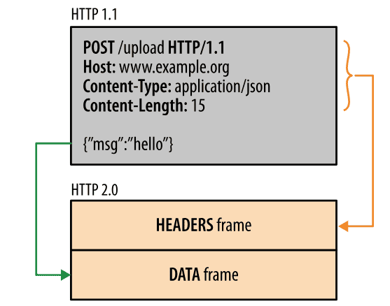 HTTP/2.0 将报文分成 HEADERS 帧和 DATA 帧,它们都是二进制格式的。