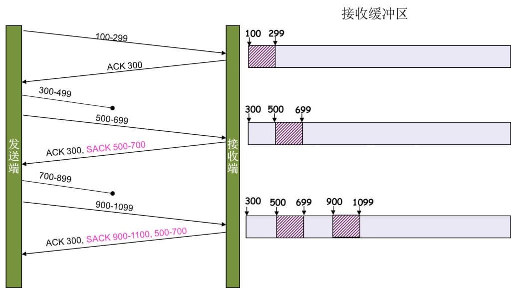 这里还需要注意一个问题——接收方Reneging,所谓Reneging的意思就是接收方有权把已经报给发送端SACK里的数据给丢了。这样干是不被鼓励的,因为这个事会把问题复杂化了,但是,接收方这么做可能会有些极端情况,比如要把内存给别的更重要的东西。所以,发送方也不能完全依赖SACK,还是要依赖ACK,并维护Time-Out,如果后续的ACK没有增长,那么还是要把SACK的东西重传,另外,接收端这边永远不能把SACK的包标记为Ack。