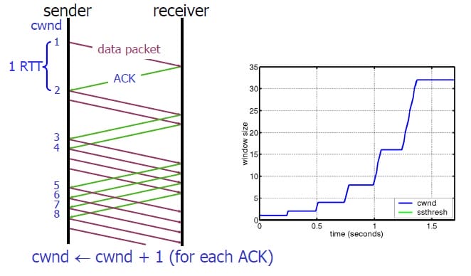 - 2)当每过一个RTT时,cwnd = cwnd + 1