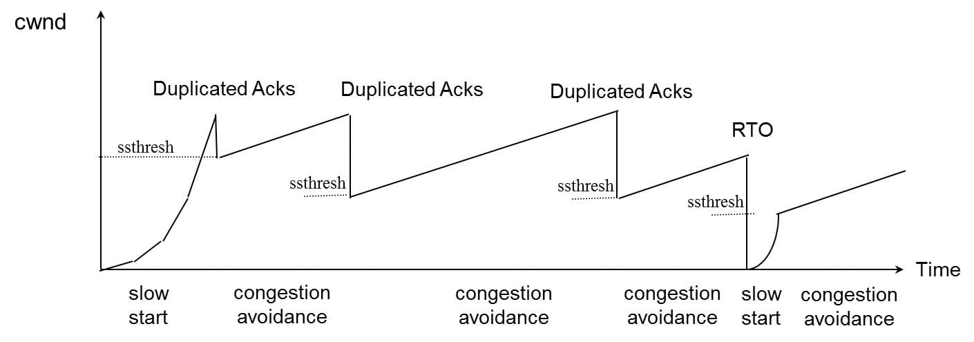 - 1988年,TCP-Tahoe 提出了1)慢启动,2)拥塞避免,3)拥塞发生时的快速重传