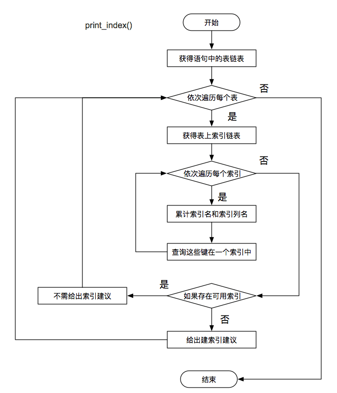 通过上述步骤,已经将每张表的备选索引键全部保存。此时,只要判断每张表中的候选索引键是否在实际表中已存在。没有索引,则给出建议增加对应的索引。 该步骤涉及的函数是:print_index() ,主要的流程图为: