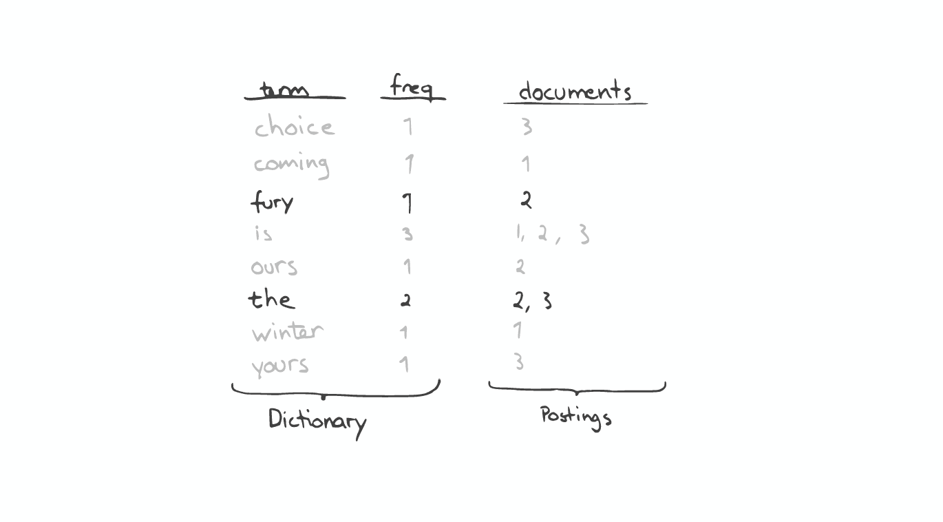 - 与单词Term对应的Postings(即存在这个单词的文件)。