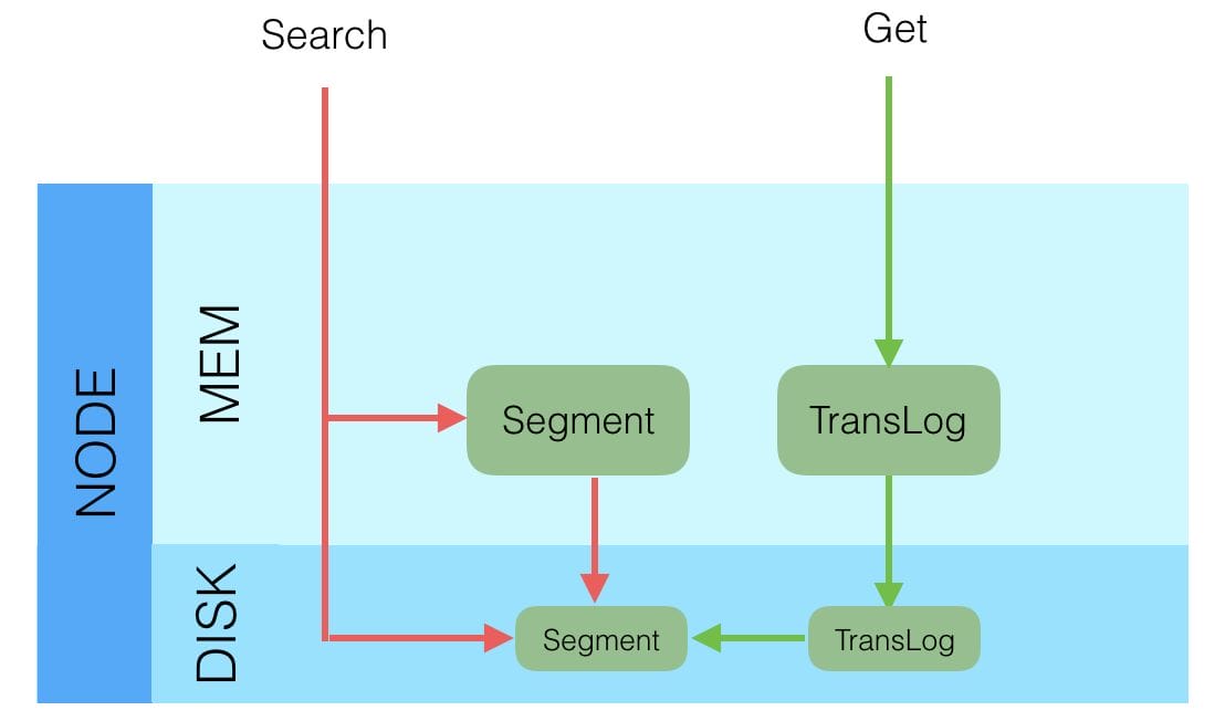 对于Search类请求,查询的时候是一起查询内存和磁盘上的Segment,最后将结果合并后返回。这种查询是近实时(Near Real Time)的,主要是由于内存中的Index数据需要一段时间后才会刷新为Segment。
