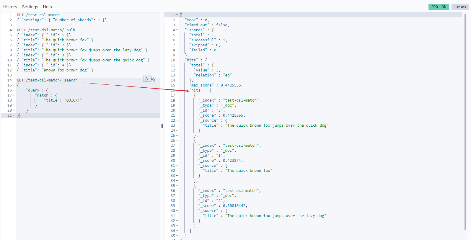 将查询的字符串 QUICK! 传入标准分析器中,输出的结果是单个项 quick 。因为只有一个单词项,所以 match 查询执行的是单个底层 term 查询。
