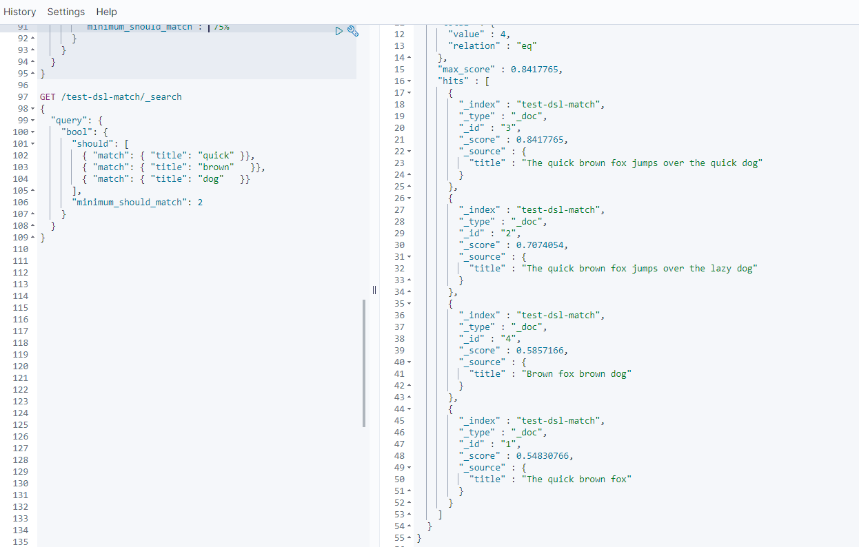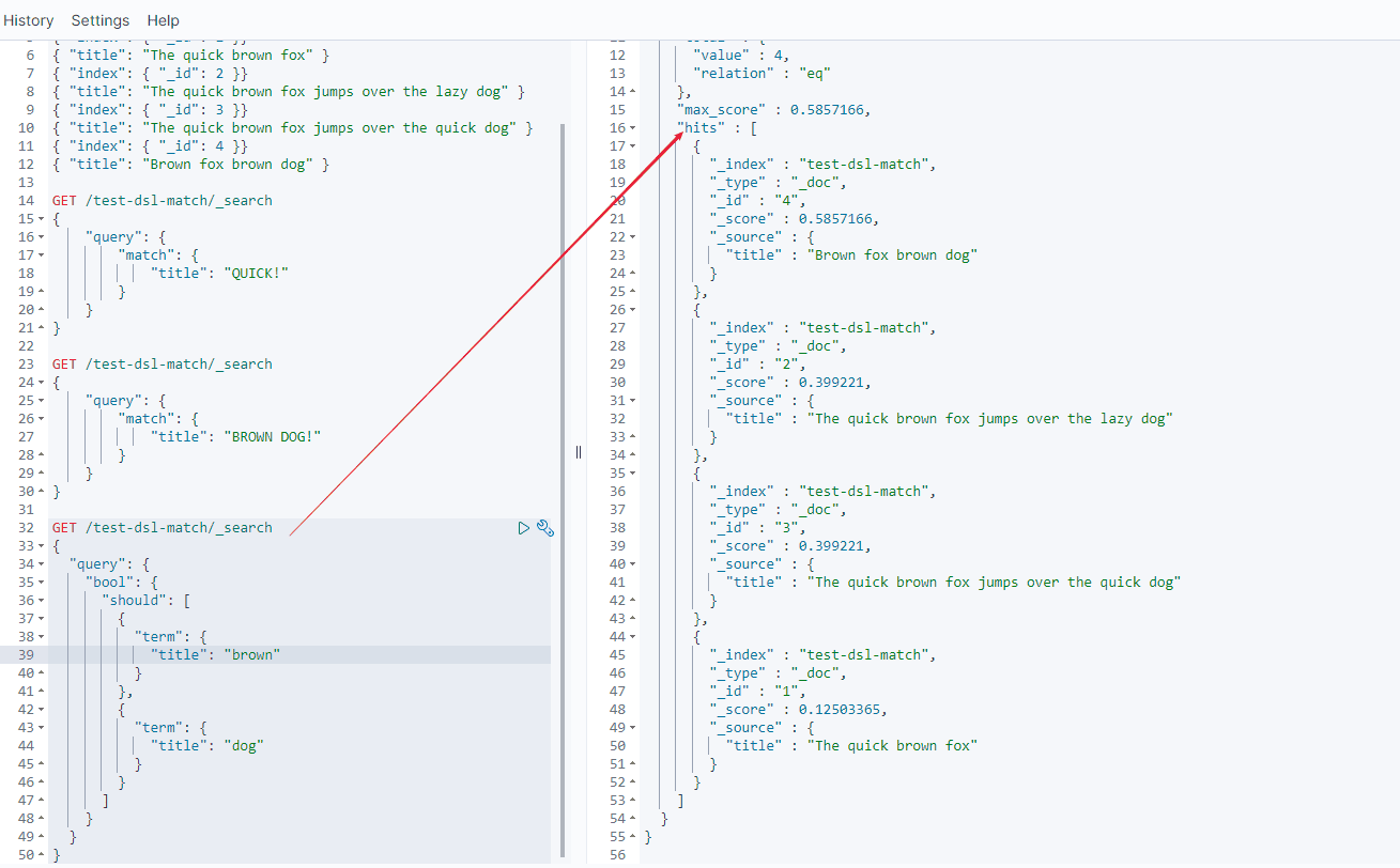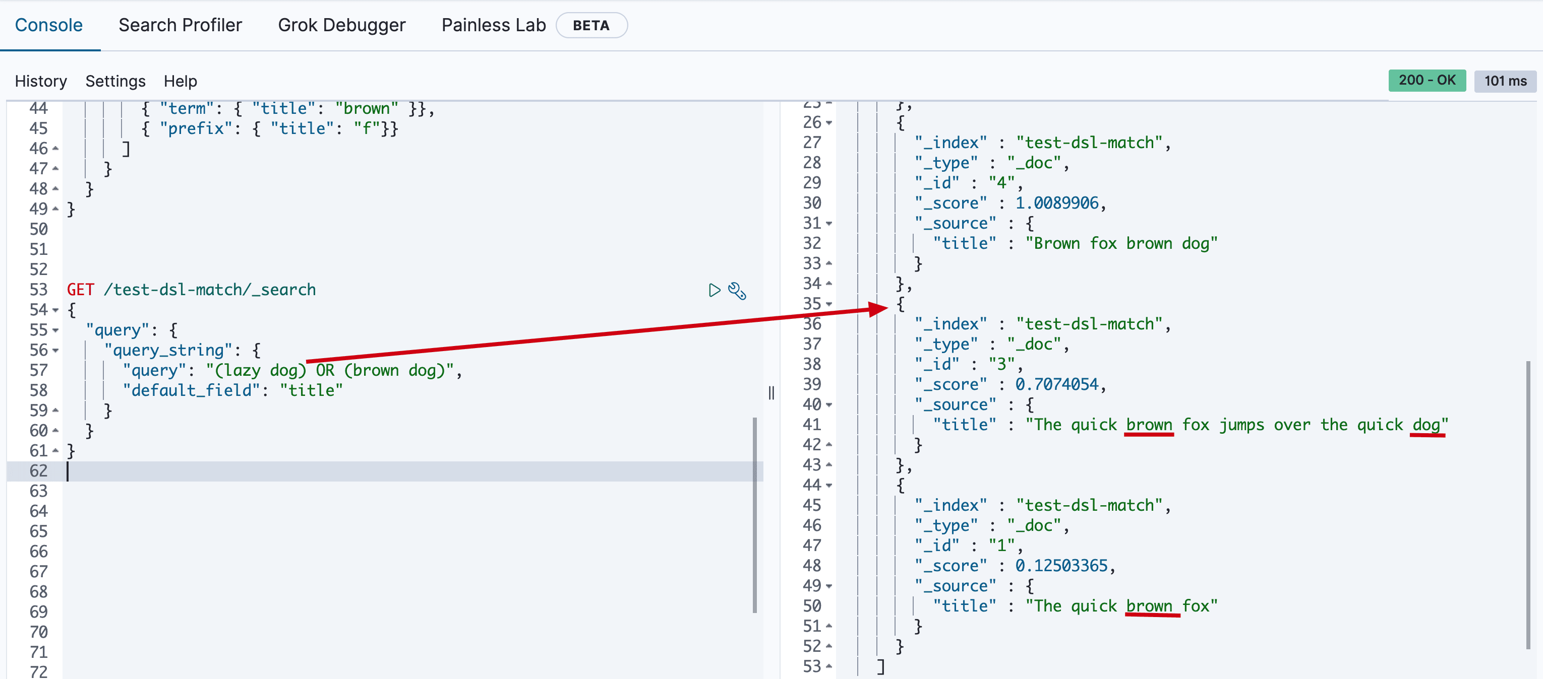因为 match 查询必须查找两个词( ["brown","dog"] ),它在内部实际上先执行两次 term 查询,然后将两次查询的结果合并作为最终结果输出。为了做到这点,它将两个 term 查询包入一个 bool 查询中,