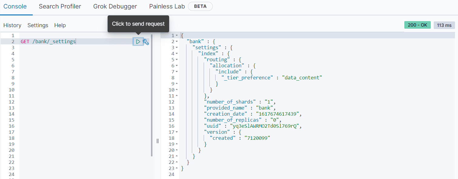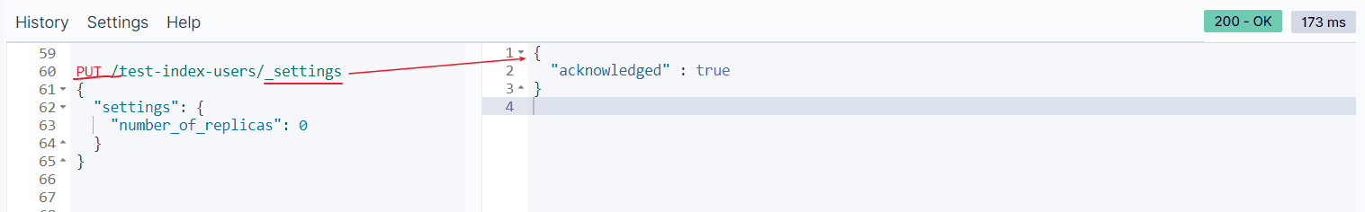 yellow open test-index-users LSaIB57XSC6uVtGQHoPYxQ 1 1 1 0 4.4kb 4.4kb我们注意到刚创建的索引的状态是yellow的,因为我测试的环境是单点环境,无法创建副本,但是在上述number_of_replicas配置中设置了副本数是1; 所以在这个时候我们需要修改索引的配置。