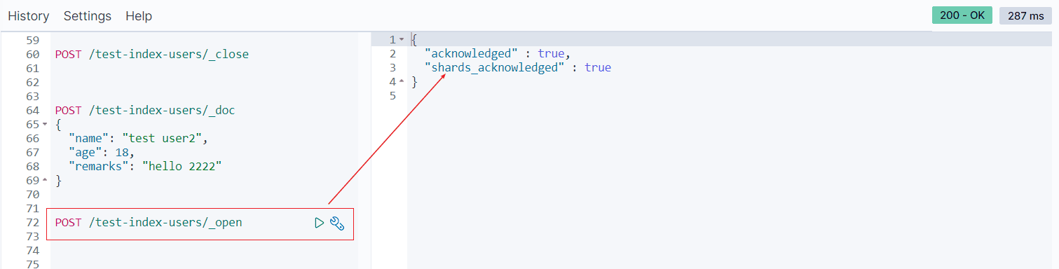 green open test-index-users LSaIB57XSC6uVtGQHoPYxQ 1 1 1 0 4.4kb 4.4kb打开/关闭索引