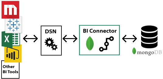MongoDB DB: 数据的存储BI Connector: 提供一个关系模式(Schema),以及BI工具和MongoDB之间转换SQL查询ODBC data source name (DSN): 连接配置数据和认证等.BI Tool: 数据分析和展示工具.