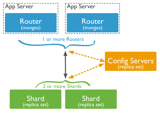 shard: 即分片,真正的数据存储位置,以chunk为单位存数据;每个分片可以部署为一个复制集。mongos: 查询的路由, 提供客户端和分片集群之间的接口。config servers: 存储元数据和配置数据。