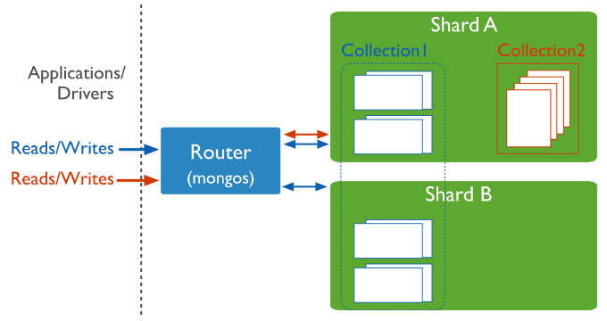 这里要注意mongos提供的是客户端application与MongoDB分片集群的路由功能,这里分片集群包含了分片的collection和非分片的collection。如下展示了通过路由访问分片的collection和非分片的collection: