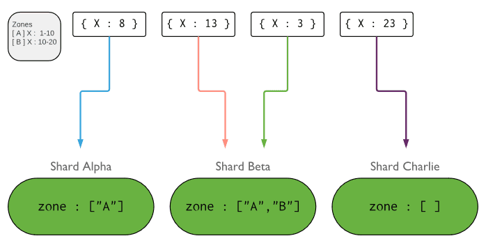下图说明了具有三个分片和两个区域的分片集群。 A区域代表下边界为1且上限为10的范围。B区域代表下边界为10且上限为20的范围。分片Alpha和Beta具有A区域。 分片Beta也具有B区。分片Charlie没有与之关联的区域。 群集处于稳定状态。