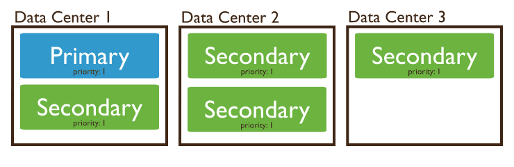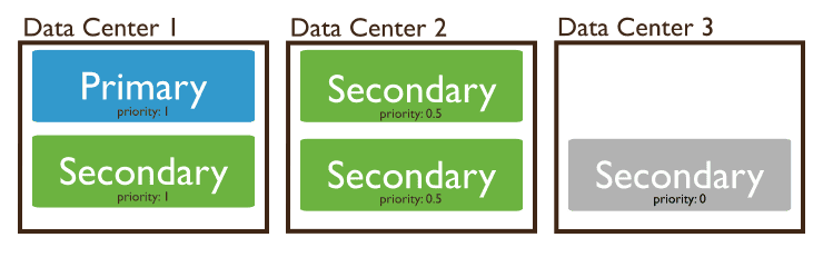 在以下示例中,数据中心1中的复制集成员具有比数据中心2和3中的成员更高的优先级;数据中心2中的成员比数据中心3中的成员具有更高的优先级: