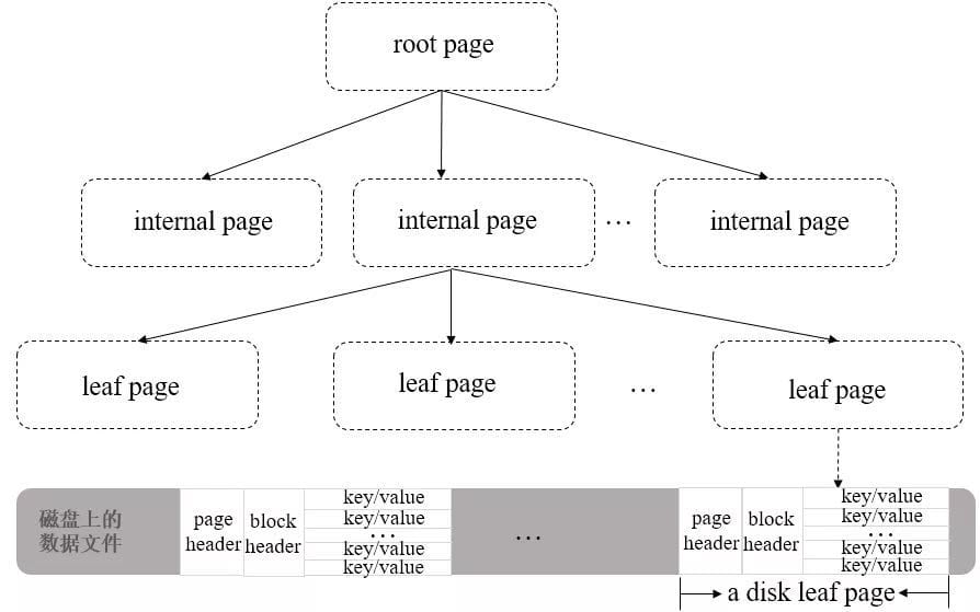 - 内存里面B-Tree包含三种类型的page,即rootpage、internal page和leaf page,前两者包含指向其子页的page index指针,不包含集合中的真正数据,leaf page包含集合中的真正数据即keys/values和指向父页的home指针;