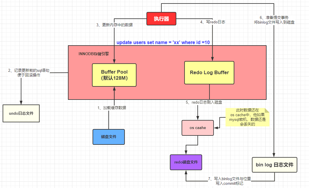 截至目前,我们应该都熟悉了 MySQL 的执行器调用存储引擎是怎么将一条 SQL 加载到缓冲池和记录哪些日志的,流程如下: