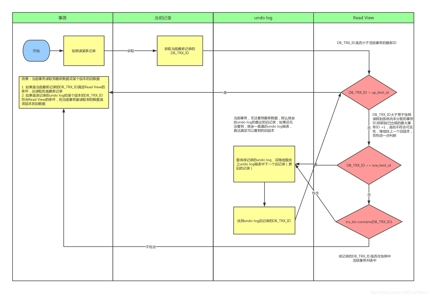 Read View遵循一个可见性算法,主要是将要被修改的数据的最新记录中的DB_TRX_ID(即当前事务ID)取出来,与系统当前其他活跃事务的ID去对比(由Read View维护),如果DB_TRX_ID跟Read View的属性做了某些比较,不符合可见性,那就通过DB_ROLL_PTR回滚指针去取出Undo Log中的DB_TRX_ID再比较,即遍历链表的DB_TRX_ID(从链首到链尾,即从最近的一次修改查起),直到找到满足特定条件的DB_TRX_ID, 那么这个DB_TRX_ID所在的旧记录就是当前事务能看见的最新老版本