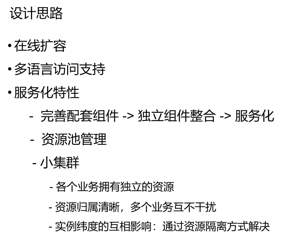 以上是我们的设计思路,一是能支持在线扩缩容,二是支持多语言的访问,因为我们是要对整个公司进行推广的,而不是说只对一个部门,所以为了推广方便我们必须有这种功能,三是对服务化特性的需求。