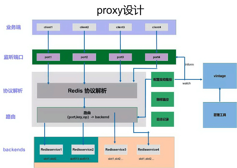 - 配置监控:监控Vintage中本proxy的配置,包括端口的变动、端口和backend的变动以及slot的变化等,通知端口监听模块和路由模块。
