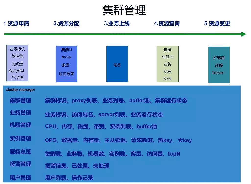 关于集群管理方面,无论是Redis也好,MySQL也好,对资源的任何管理都可以用这个来总结,包括五个部分:资源申请,资源分配,业务上线,资源查询,资源变更。
