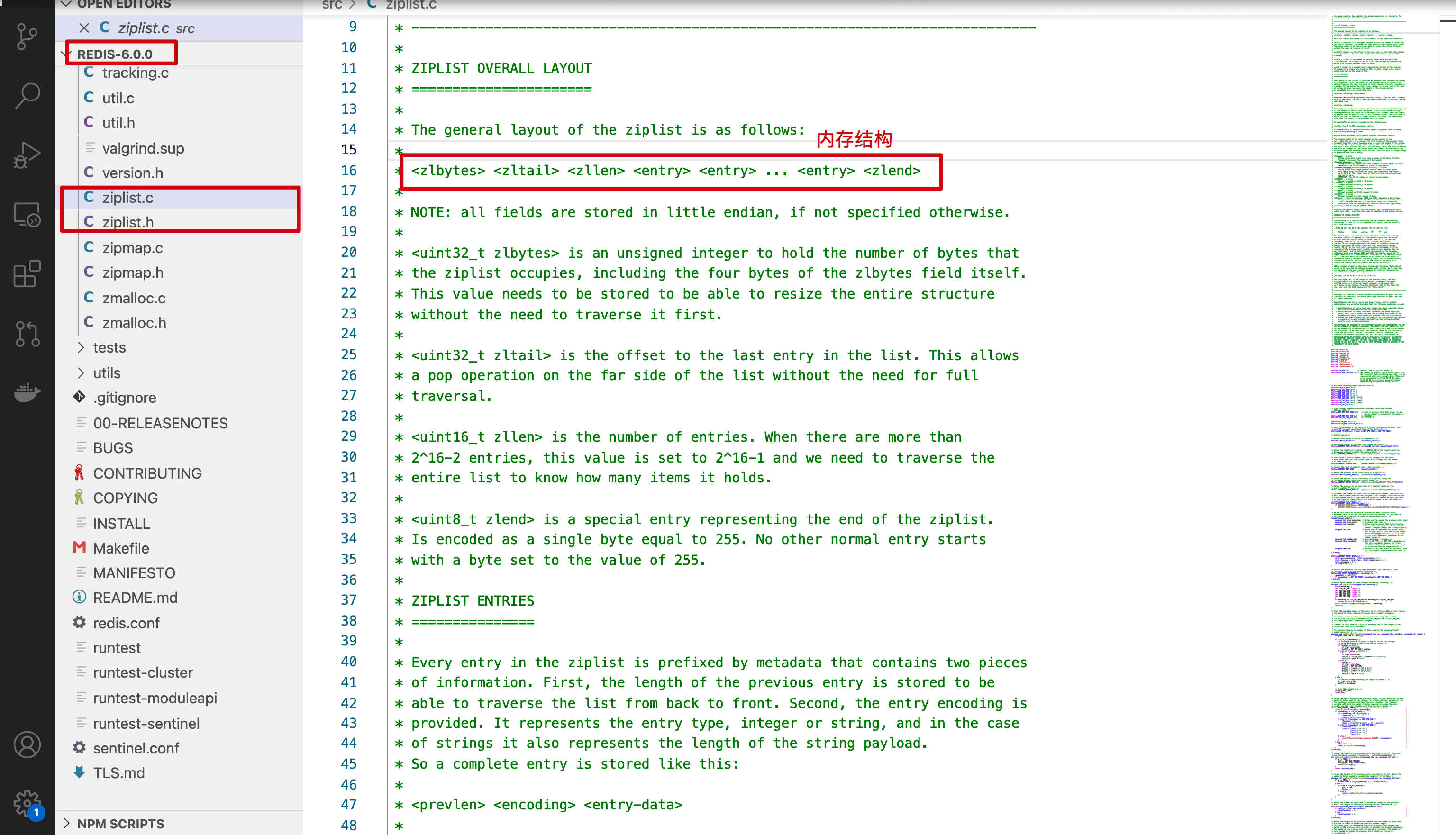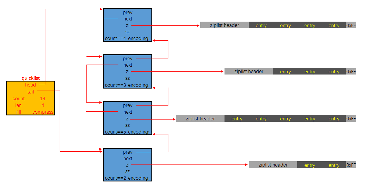 zlbytes字段的类型是uint32_t, 这个字段中存储的是整个ziplist所占用的内存的字节数zltail字段的类型是uint32_t, 它指的是ziplist中最后一个entry的偏移量. 用于快速定位最后一个entry, 以快速完成pop等操作zllen字段的类型是uint16_t, 它指的是整个ziplit中entry的数量. 这个值只占2bytes(16位): 如果ziplist中entry的数目小于65535(2的16次方), 那么该字段中存储的就是实际entry的值. 若等于或超过65535, 那么该字段的值固定为65535, 但实际数量需要一个个entry的去遍历所有entry才能得到.zlend是一个终止字节, 其值为全F, 即0xff. ziplist保证任何情况下, 一个entry的首字节都不会是255